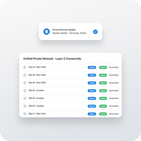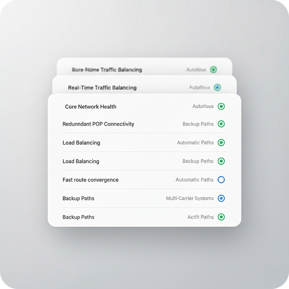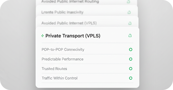 Our VPLS backbone connects all POPs into a single private transport fabric, ensuring traffic remains within controlled routes rather than unpredictable public networks.